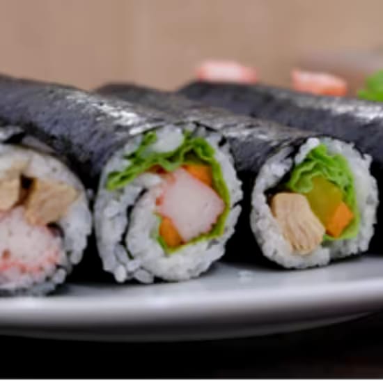 🐟 Create three classic rolls: California Roll, Spicy Salmon Roll, and Vegetable Roll