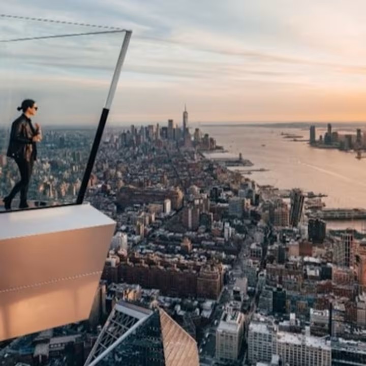 🏙️ Lean out over frameless glass panels for stunning views of the Manhattan skyline